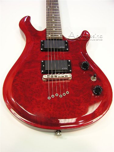 * Alder Body With Burled Maple Cap * 2 Active Humbucking pickups * 1 Volume , 1 Tone * 3 position Toggle Switch * Fixed Tune O Matic Bridge * String Thru Body * Transparent red finish * Shipped Insured! * Brand New!