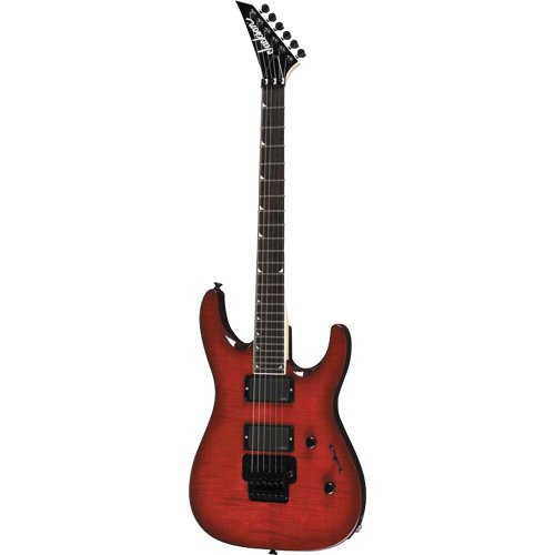 EMG-81 and 85 high-output humbuckers produce scorching tone while the compound-radius rosewood fretboard curves dramatically at the nut for easy chording and flattens out as it approaches the neck joint for wide bends without fretting out. Yank those notes right on up to ecstasy with the recessed-cavity, Floyd Rose Licensed double-locking tremolo system. Includes deluxe Jackson molded case by SKB.